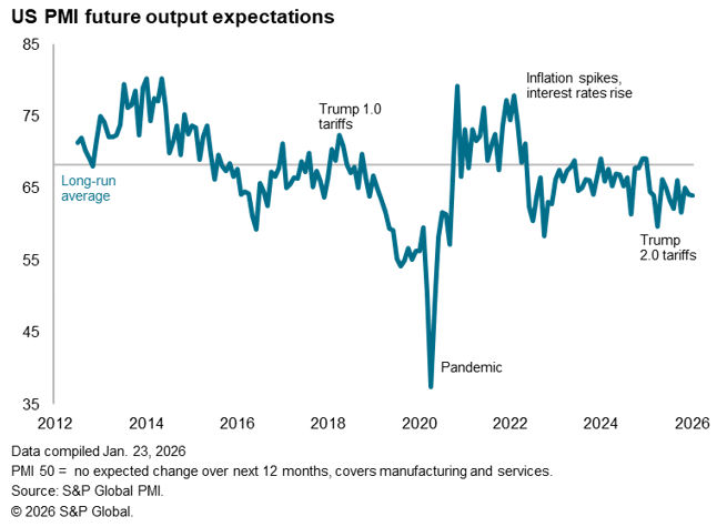 Confidence in the year ahead outlook meanwhile remained positive but dipped slightly lower, as hopes for sustained economic growth and favorable demand conditions were somewhat offset by ongoing worries over the political environment and higher prices.