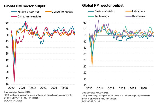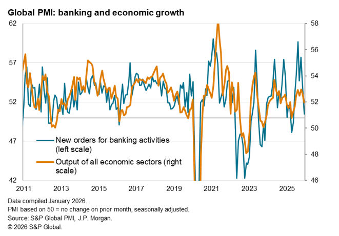 Growth of new orders for banking services slowed especially sharply in December, rising only marginally to signal the smallest increase since last May. A deteriorating trend for banking services is often an indicator of a broader slowdown in the global economy, hinting that global growth could weaken further in the coming months unless banking activity revives.