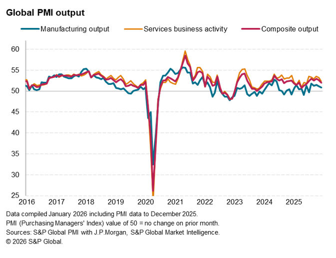 The worldwide PMI surveys produced by S&P Global in association with ISM and IFPSM for J.P.Morgan signalled further growth of business activity in December, but the rate of expansion moderated to the lowest since June. This reflected a slowing of growth across both manufacturing and services.
