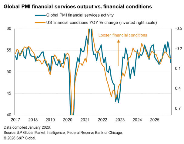 The global economic upturn lost a key ingredient of its recent strength in December, as growth of financial services activity weakened to register one of slowest expansions recorded over the past three years. Demand for banking services has slowed especially sharply, which is often a harbinger of weaker global economic growth.