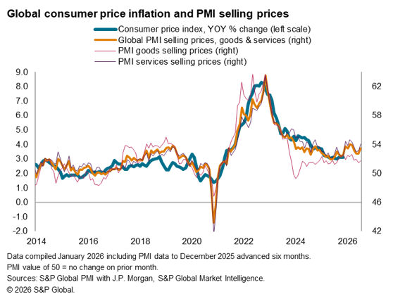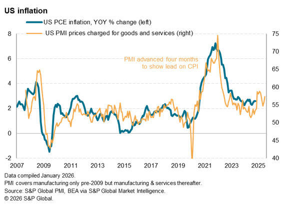 As such, US PMI output prices, or the prices charged, index continued to provide useful insights into inflation trends through the government shutdown period and well in advance of official data. The latest figure from December pointed to a slight increase in price pressures, attributed to the impact of higher tariffs, according to companies surveyed, and is indicative of US personal consumption expenditure (PCE) price index – the US Federal Reserve’s preferred inflation gauge – rising to around 3.0% in the coming months. While more subdued employment and slower growth conditions continue to pave the way for the Fed to lower rates in 2026, the latest inflation indications from the PMI provide a reason for greater caution in the immediate term.
