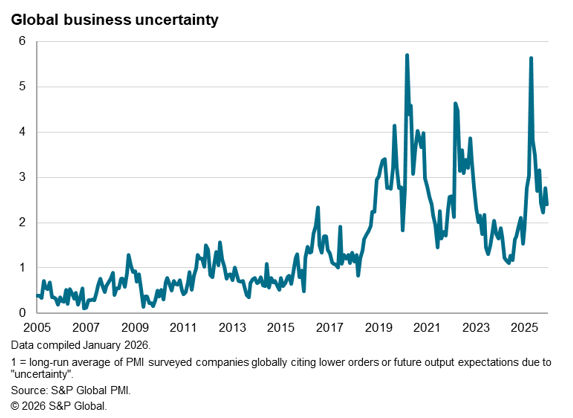 2025 may be characterised as the year when widespread US tariffs induced heightened uncertainty for global businesses. The degree of business uncertainty, as measured by the PMI comment tracker, at one point surged to match that seen at the peak of the COVID-19 pandemic. However, economic growth, as measured by the PMI’s gauge of current output as well as official GDP data, has largely proven surprisingly resilient despite this uncertainty.