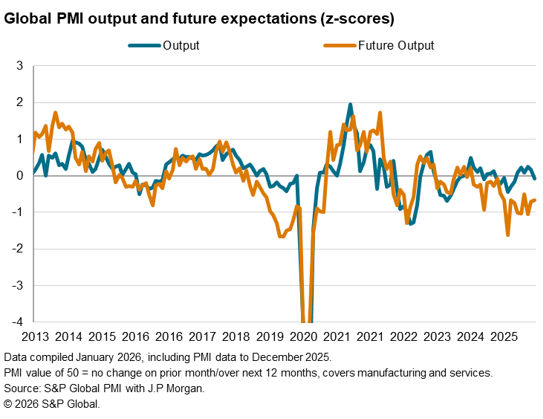 On one hand, the data reminded us that actual output could differ from business sentiment, even when both measures come from the same survey. PMI survey respondents indicated that this reflected idiosyncratic factors, including the front-loading of goods orders through 2025 ahead of the implementation of higher US tariffs on imports, and investments related to artificial intelligence (AI) developments, sometimes designed to cut costs. This meant output grew despite the lack of confidence.