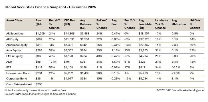 In December, the securities lending markets generated monthly revenues of $1.2B, reflecting a 24% year-over-year increase and closing out the tenth consecutive month of revenues surpassing the $1B mark. Revenues continued to be pushed higher thanks to further sustained demand for Asian equities. December revenues for the asset class increased by 57% year-on-year as Hong Kong, South Korean, Taiwanese, Japanese and Malaysian equities continued to post substantial year-on-year improvements in returns. Across EMEA equities, revenues also demonstrated strong year-on-year growth as UK, French, Swedish and German equities all experienced an increase in demand. UK equities were one of the standout performers during the month as average fees increased by 56% year-on-year to 0.43% and revenues grew by 127%. In the Americas US equity revenues dipped both year-on-year and month-on-month after falling to their lowest monthly total since May. US equities had a phenomenal 2025 however as annual revenues grew by 24% year-on-year to $4.8B. ADRs were one of the standout performers in the region as investors looked for alternative routes to short foreign equities. ADR revenues increased by 101% year-on-year during the month, generating their second highest monthly revenues of 2025. Average fees also hit their second highest level of the year as well after reaching an average of 138bps. Brazilian and Mexican equities also performed well during the month with strong growth in year-on-year revenues as average fees across Brazil once again climbed close to the 2% mark and after Mexican average fees hit a 2025 high of 71bps.