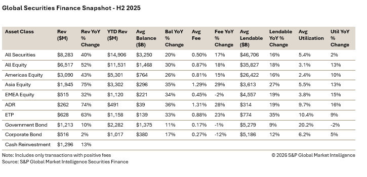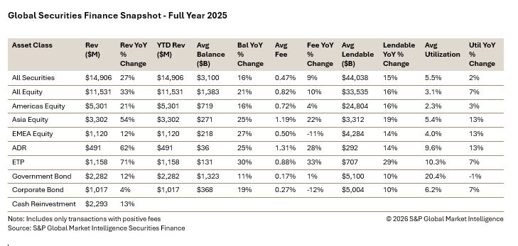 In the securities lending markets during Q4, revenues exhibited strong year-over-year performance, with all asset classes showing positive year-on-year growth apart from corporate bonds. The fourth quarter closed out a very strong year for the securities lending industry as revenues generated were some of the highest on record. Not surprisingly many of the trends that followed throughout 2025 were still present during Q4. Equities in both the US and Asia continued to thrive as did ADRs and Exchange Traded Products. Asian equities finished the quarter 71% higher year-on-year as growth was seen across most countries. Government bond markets experienced continued volatility with falling interest rate moves seen across all regions. Despite falling interest rates in the US, EMEA and the UK, bond yields climbed as fiscal uncertainty remained front and center. Corporate bonds was the only asset class to suffer a decline in revenues when compared year-on-year. The decline was negligible however after falling by only 1%.