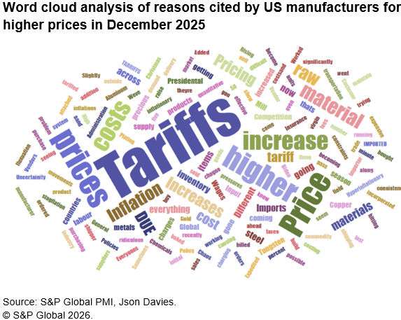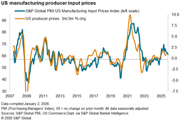Some encouragement comes from input cost inflation moderating in December to the lowest recorded since last January. However, while this cost trend suggests the tariff impact on inflation peaked back in the summer, costs are still rising month-on-month at an elevated rate to suggest that US firms continue to face higher cost growth than competitors in most other major economies, as has been the case since last February.