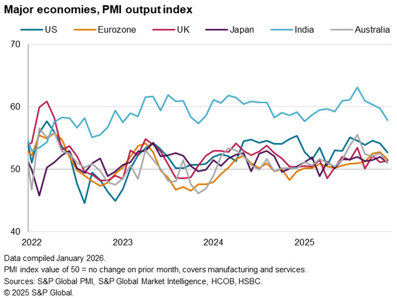 In Europe, the main economic news comes from the UK, with updates to labour market, retail sales, and inflation statistics. These data follow a stronger-than-expected GDP reading for November, which aligned with the sluggish growth trend signalled by the PMI late last year, and a marked slowdown in inflation to 3.2% in November. A further drop in inflation will increase calls for further rate cuts from the Bank of England, especially if labour market data continue to disappoint. Recent months have seen sharp job losses, which survey data indicate persisted through to the year-end.
