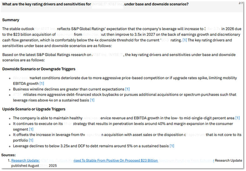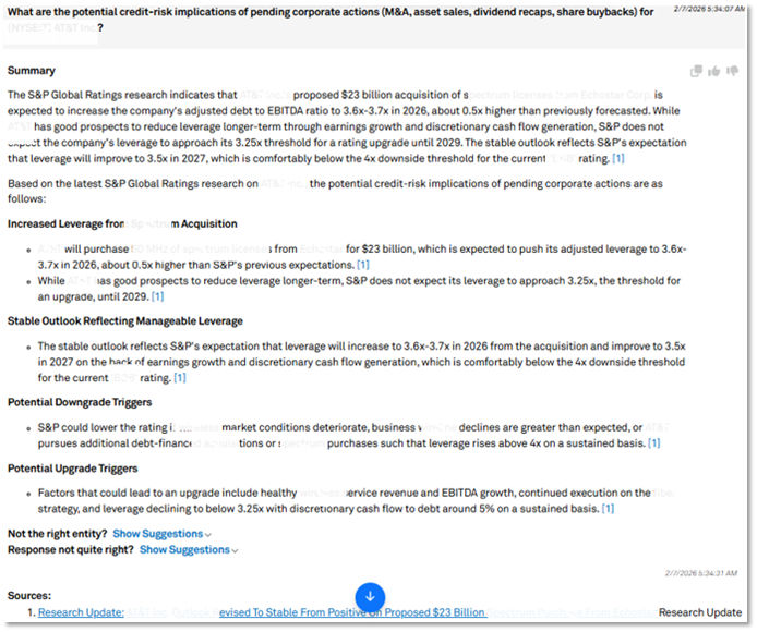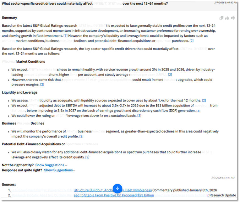 Source: CreditCompanionTM on RatingsDirect® on S&P Capital IQ Pro, S&P Global Market Intelligence. As of February 2026. For illustration only. CreditCompanionTM is powered by generative AI technology, which may produce inaccurate responses. Please review the Legal Disclaimer for more information.