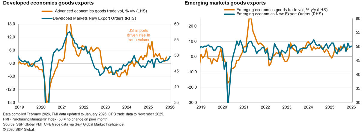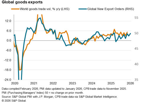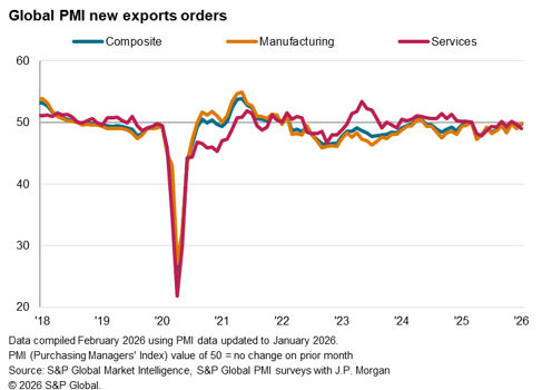The worldwide Purchasing Managers’ Index (PMI) surveys compiled by S&P Global Market Intelligence indicated a near-stabilisation of global trade at the start of 2026. The seasonally adjusted Global PMI New Export Orders Index, sponsored by J.P.Morgan and compiled by S&P Global, rose to 49.7 in January, up from 49.3 in December. Despite indicating a second monthly deterioration in global trade, the pace of decline was only marginal.