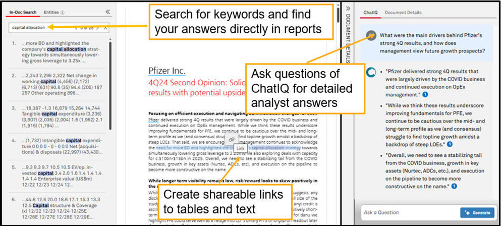 | ChatIQ and Document Intelligence Unlocked Insights and Efficiency by Integrating Research with AI | ChatIQ and Document Intelligence within S&P Capital IQ Pro harnessed generative AI capabilities to analyze vast document repositories while enabling users to generate deep insights with precise citations for full auditability. Integrated views brought together Aftermarket Research with additional sources such as filings, news articles, earnings call transcripts, and macroeconomic updates (Pronto). Searchable topics, industry overlays, and automated insight extraction allowed analysts to search across multiple documents efficiently, helping them understand how the market evaluates companies, emerging trends, and broader economic drivers. | |