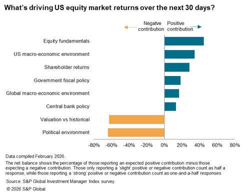 An assessment of what is driving returns in the near-term showed that US equity investors remain highly concerned about the political environment and valuations at the start of February. However, positive expectations regarding central bank policy were also greatly pared back from January as markets priced in a lower chance of rate cuts in the few months of the year.
