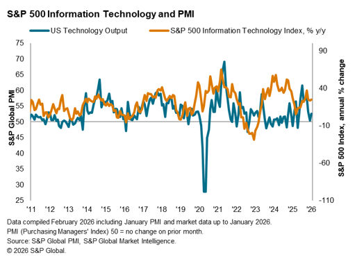 While the S&P 500 technology sector exhibited resilience in January, reduced preference towards the IT/tech sector, according to the IMI index, and a subdued US Technology Sector PMI Output Index suggest that tech stock prices are still elevated.