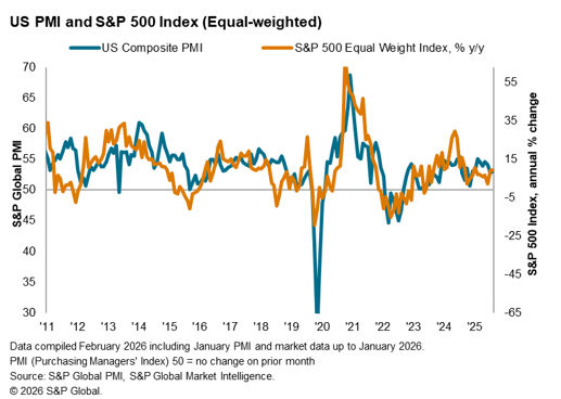 Cross-comparison of the US PMI and the equal-weighted S&P 500 index revealed convergence at the start of the year, notably with the year-on-year change of the equal weighted S&P 500 index rising at a quicker pace around the turn of the year with more broad-based gains on the index.