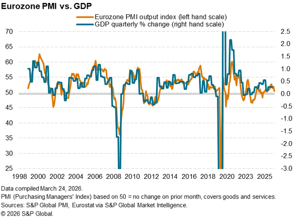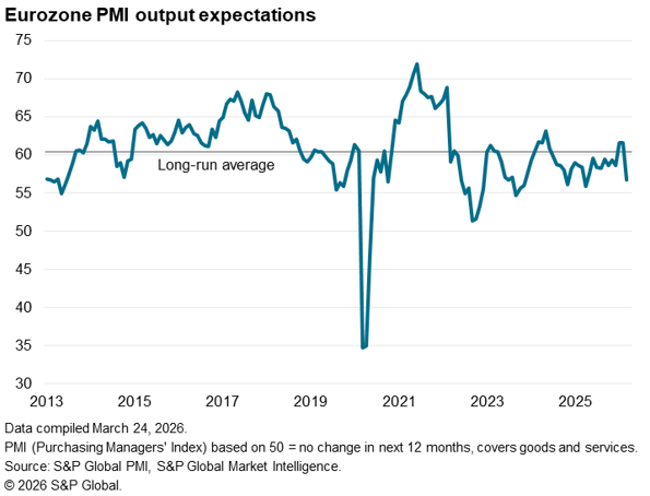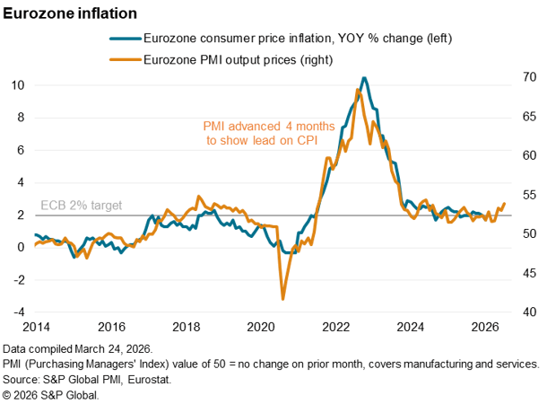 The feed-through of higher costs to selling prices has been muted so far, according to the flash PMI for March, though the survey’s selling price gauge has nonetheless already risen to its highest since February 2024 and at a level indicative of consumer price inflation accelerating close to 3%.