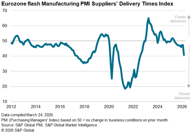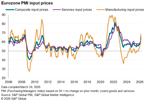 March’s flash PMI survey data from S&P Global showed firms’ costs rising across the eurozone at the fastest rate for over three years amid the surge in energy prices and choking of supply chains resulting from the war in the Middle East.