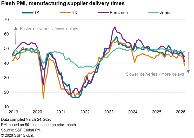 The degree to which stagflation may become a problem for policymakers will depend principally on the duration of the conflict in the MENA region, with signals tracked by the PMI’s survey gauges measuring firms’ output, input costs and supply chain delays – the latter providing a valuable insight into the degree to which scarcities are likely to drive up inflation further and constrain economic growth in various economies. March saw delivery delays become more widespread, though have so far remained modest compared to the pandemic.