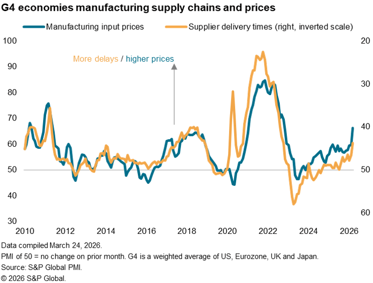 Input cost increases could be largely attributed to the spike in energy prices seen since the US-Israeli attacks commenced at the end of February, but a more lasting inflationary impact could become evident if supply conditions worsen amid the de facto closure of the Strait of Hormuz.