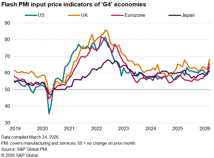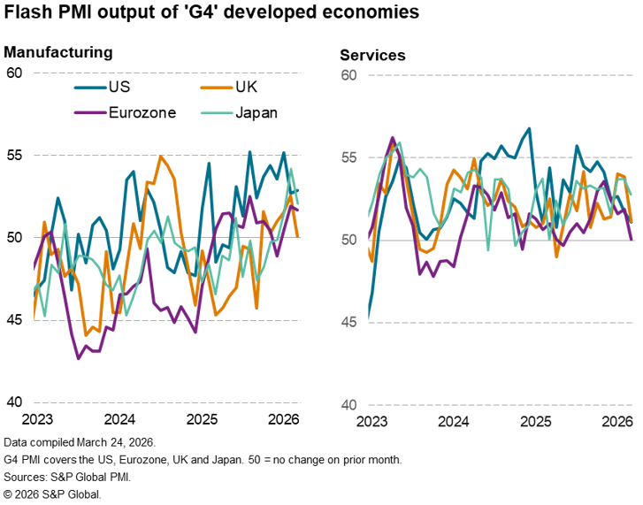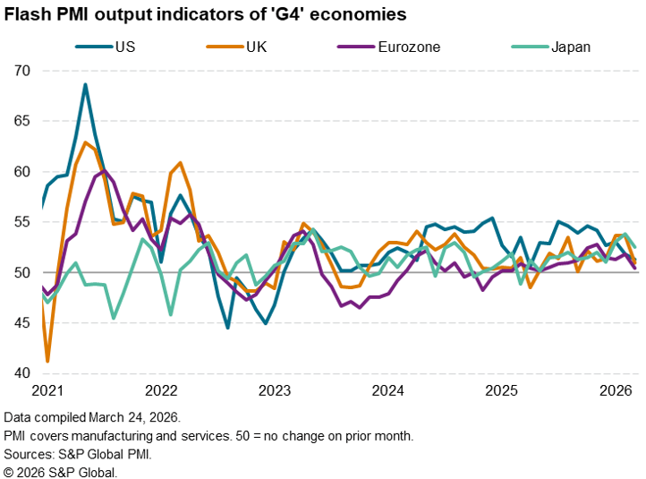 S&P Global’s flash PMI data showed output growth slowing in all four largest developed economies in March following the outbreak of war in the Middle East. Inflationary pressures meanwhile picked up across the board to signal a growing risk of the global economy moving into a period of heightened stagflation risk.