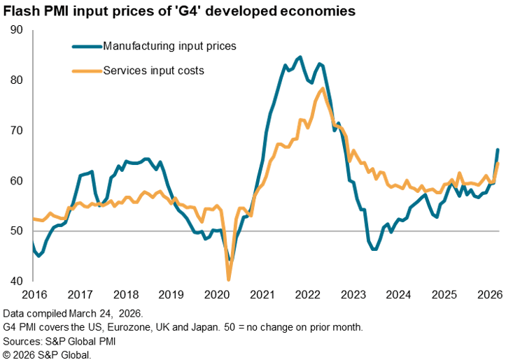 The flash PMI surveys also showed a steep increase in price pressures during March. Measured across goods and services, input costs rose among the G4 economies at the fastest rate since January 2023. Service sector costs increased at a rate not seen since April 2023 while manufacturers reported the sharpest cost increase since October 2022. The jump in manufacturing inflation was notable in being the largest monthly change recorded since comparable G4 data were first available in mid-2007.