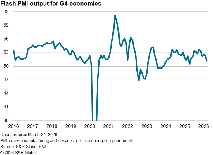 Business activity growth across the four largest developed economies – the ‘G4’ – slowed in March to its weakest since the announcement of US tariffs in April of last year, according to S&P Global’s flash PMI data. The data provide the first indication of the war in the Middle East having had an immediate and material impact on global economic growth.