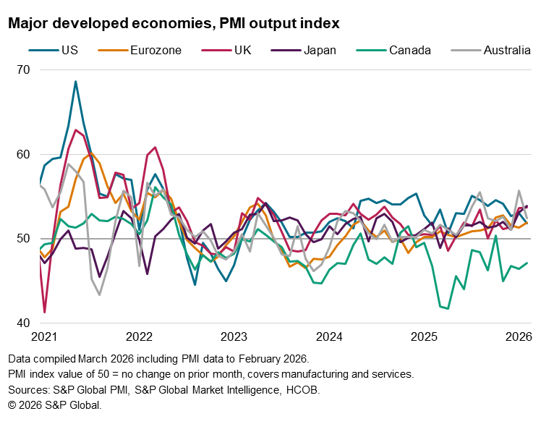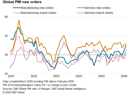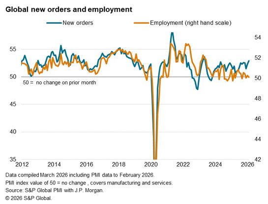 Global PMI surveys indicated an acceleration of worldwide economic growth prior to the outbreak of the Middle East war, with the expansion hitting the fastest since May 2024.