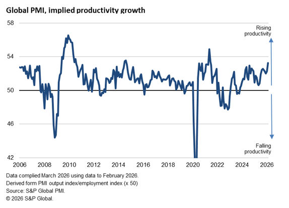 Recent productivity growth can be traced to companies reporting the need to reduce cost overheads amid elevated input price inflation and the uncertain economic outlook. Measured globally, input cost inflation across manufacturing and services has been running well above the long-run average since the pandemic. With the war in the Middle East driving energy costs sharply higher, and fueling further geopolitical uncertainty, the economic environment is likely to place further pressure on companies to seek productivity gains in the coming months.