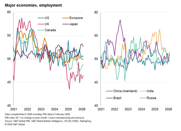 While jobs growth picked up in both India and Brazil, rates of job creation remained modest compared to the highs seen last year. Falling employment was meanwhile seen in both Russia and mainland China.