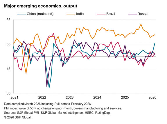Although India continued to report the fastest output growth among the four largest “BRIC” emerging economies in February, as has been the case over the past four years, the biggest change was recorded in mainland China, where the rate of growth accelerated sharply to the fastest since May 2023.