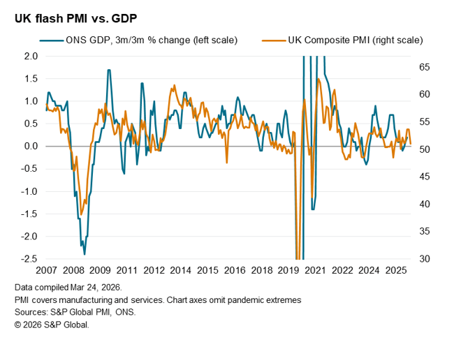 The PMI headline Composite PMI Output Index has slumped from 53.7 in February to a six-month low of 51.0 in March, according to the preliminary ‘flash’ reading. The latest reading is broadly consistent with GDP growth stalling in March, albeit with a modest 0.2% quarterly rise indicated for the first quarter as a whole.