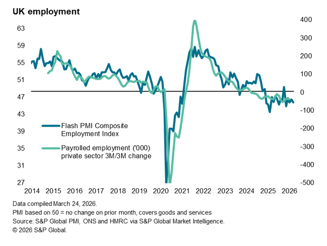 The loss of confidence led to further job losses in March, with employment dropping across manufacturing and services at a slightly increased rate. Jobs have been cut continually since October 2024, according to the PMI survey panel, focused primarily on the need to offset higher staffing costs introduced in the past two autumn Budgets.