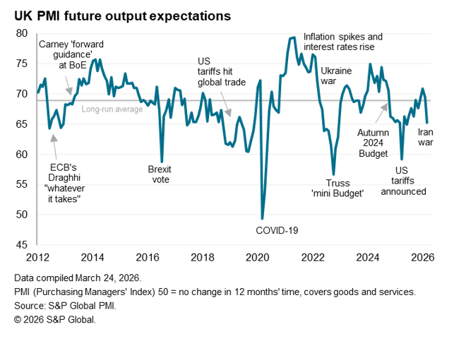A further toll on the economy from the war appeared via a sharp deterioration in business optimism. Companies’ expectations about the outlook for the year ahead sank to the lowest since last June, when confidence had been hit by US tariff worries, dropping well below the survey’s long-run average. The deterioration marks a sharp reversal of the recovery of confidence seen at the start of the year, when business expectations had revived to a 16-month high.
