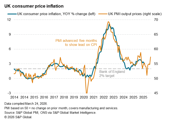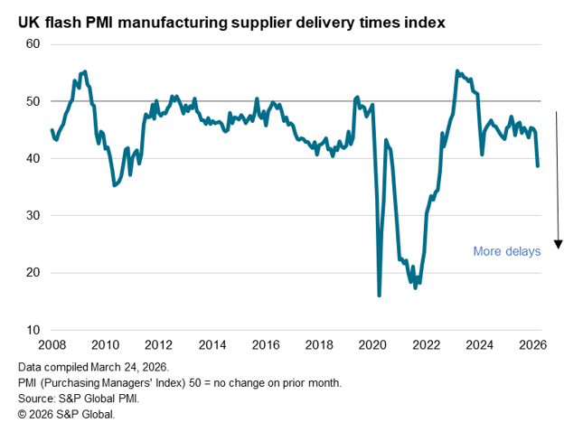 Manufacturers likewise reported a broad-based demand hit from the war, with customers often postponing or cancelling orders, though factories also cited the war’s disruption to supply chains. Supplier delivery times lengthened in March to the greatest extent since July 2022, when supply chains were affected by the pandemic. Half of all companies reporting longer lead times attributed the deterioration to the events in the Middle East to some extent, often citing the need to divert shipping due to the conflict. March’s supply delays are by no means as severe as seen during the height of the COVID-19 disruptions, though are more pronounced than seen during the escalation of Houthi Red Sea attacks in 2024.