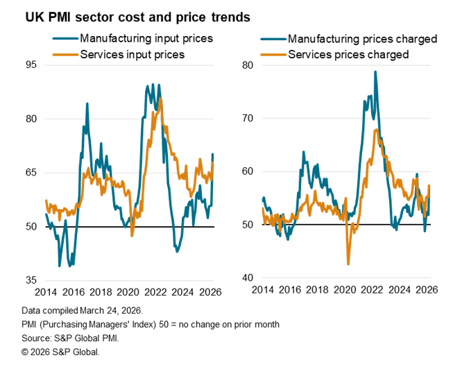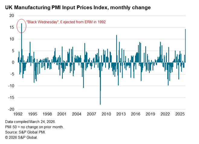 The biggest impact of the war, however, was on prices. Higher energy and fuel prices, the latter driving up freight and shipping costs, exacerbated existing upward price pressures – notably from rising wage costs – to push input cost inflation up to its highest since February 2023.