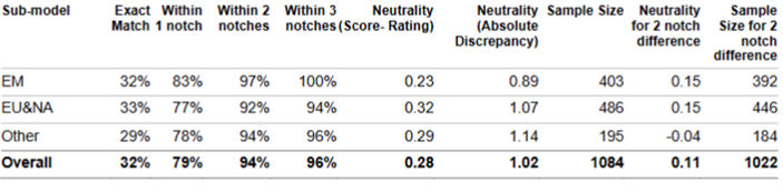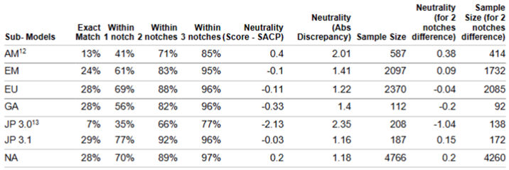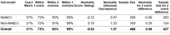 In the tables above, the third column (Within 2 notches) is considered a standard of performance measure. For CM Corporates, across North American & EU sub-models the performance measure sits at 89%, which means that 89% of the time CM Corporates will produce a lower-case credit score that sits within 2 notches of an actual S&P Global Rating. Similarly, for CMFI Banks & Insurance, the model is even stronger, sitting at an overall 94% and 93%, respectively.