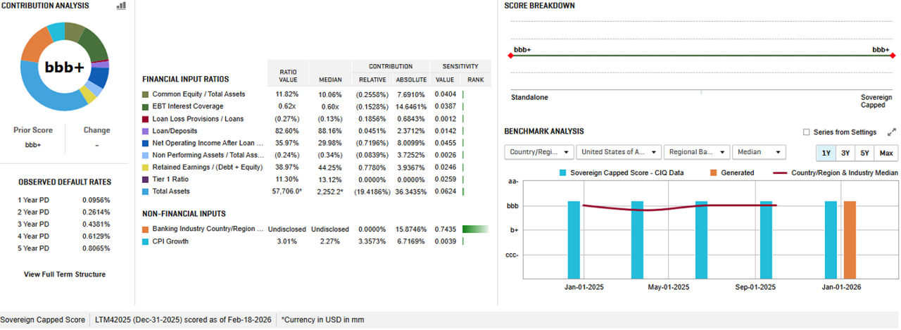 Pinnacle Financial Partners, Inc. operates as the bank holding company for Pinnacle Bank that provides various banking products and services. On Jan 1 , 2026, Pinnacle Financial Partners Inc. (Pinnacle) merged with Synovus Financial Corp. (Synovus), with Pinnacle Financial Partners and Pinnacle Bank the surviving entities. S&P Global Rating assigned a long-term issuer credit rating of BBB- to Pinnacle Financial Partners, Inc. and BBB to Pinnacle Bank. CreditModel had Pinnacle scored at bbb+ before the official S&P issuer credit rating was assigned, which put the credit score within 2 notches of the issuer credit rating (BBB-) assigned to Pinnacle Financials Partners and within 1 notch of the issuer credit rating (BBB) assigned to Pinnacle Bank. In the snippet below, it can be observed that the CreditModel scores Pinnacle Financial at bbb+ based on the Dec 31 financials, and it also presents the historical scores going back a year at bbb+.