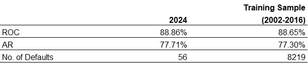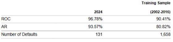 An important aspect of the PD assessment system is its ability to correctly rank order default risk. Discriminatory power analysis assesses how well a model discriminates between different scores, if existent, and tests the ordinal ranking of the PD values. For these purposes, Accurate Ratio (AR) and ROC are utilized and the results are documented below for both private and public corporates. The below results showcase excellent discriminatory power in the PDFN model as per the 2024 validation.
