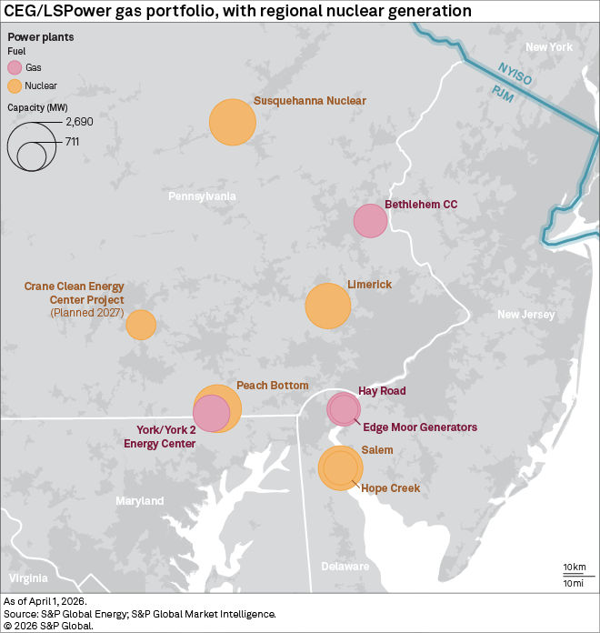 LS Power owns or operates just over 19 GW of generation in the US, including 4 GW in PJM. While most of its assets nationwide (16 GW) are natural gas, only about a third of its PJM footprint includes gas generation, following the announced sale of gas generation to NRG in May 2025. With the Constellation assets purchase, LS Power doubles its operating capacity in PJM and significantly expands its gas fleet from current levels.