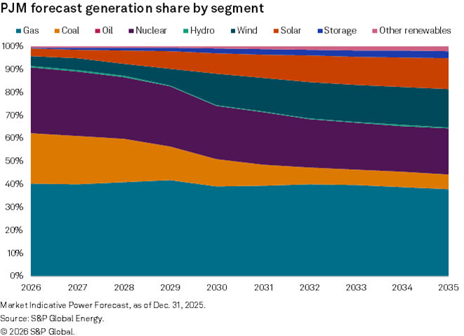 While the assets are well-positioned to capture expanding data center demand in Virginia and Pennsylvania, they have notable locational disadvantages. Gas combined-cycle generation in the tri-state region of Ohio, West Virginia and Western Pennsylvania is closer to less expensive natural gas from the Marcellus and Uinta shale basins. Additionally, expected rapid growth of renewable generation centered in the eastern seaboard states of New Jersey, Maryland and Virginia creates added pressure on wholesale electricity revenues and generation levels. Across PJM, the Market Indicative Power Forecast estimates that combined solar and wind generation share will grow from 7.8% this year to 30.0% by 2035. While coal generation share is forecast to decline the most, the Market Indicative forecast projects that the gas portfolio's capacity factors will hold steady at 50% over the next four years, before falling to levels closer to 30% beyond 2030.