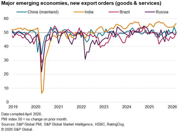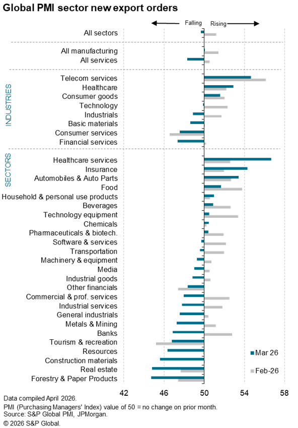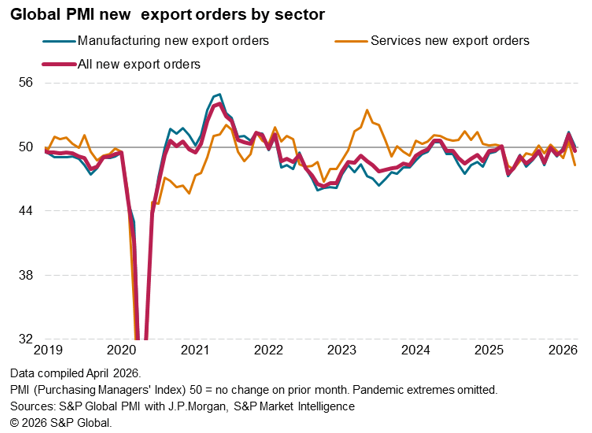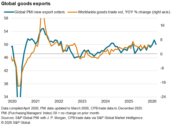 The worsening trade picture was driven by the sharpest fall in exports of services for ten months. Manufacturing export orders meanwhile rose only very marginally, the expansion weakening from February’s 56-month high led by fewer exports of basic materials amid the blockage of vessels in the Strait of Hormuz. The March manufacturing PMI data nevertheless indicated encouraging resilience and a further modest revival of manufacturing exports globally, broadly consistent with goods export volumes growing at a 5% annual rate.