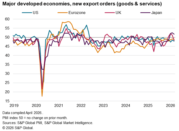 The worldwide Purchasing Managers’ Index (PMI) surveys indicated that global trade slipped back into decline at the end of the first quarter on the outbreak of war in the Middle East. The seasonally adjusted Global PMI New Export Orders, sponsored by J.P.Morgan and compiled by S&P Global, fell to 49.7 in March from 51.2 in February, dropping below the 50.0 neutral mark to signal falling trade volumes. March’s decline comes after trade rose in February for the first time in nearly a year, in part reflecting easing headwinds from US tariff policy. While the February reading, which had been the highest since November 2021, had been compiled just ahead of the outbreak of war in the Middle East, March’s data reflected the deteriorating trade environment amid the escalation of the conflict.