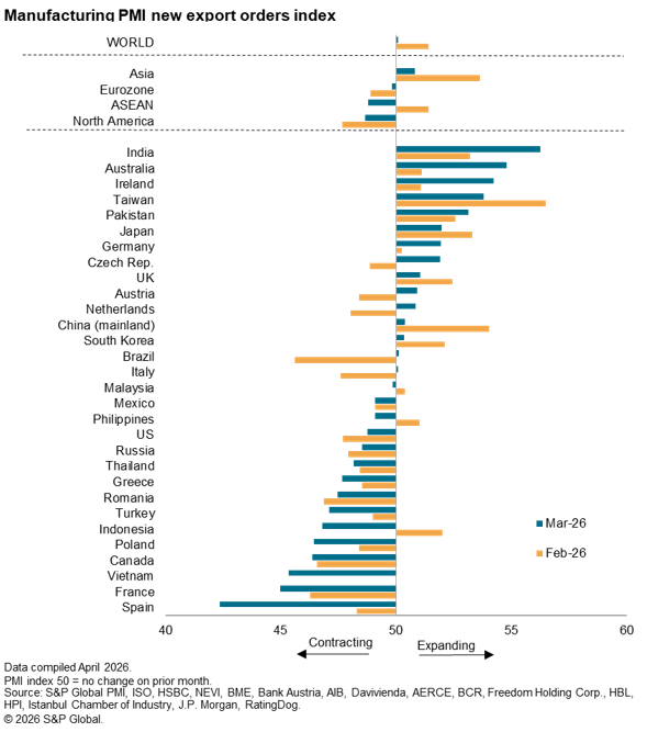 S&P Global’s PMI survey data showed a weakening trend in worldwide trade in March, indicating that the outbreak of war in the Middle East has knocked off course a trade recovery that had been building earlier in the year. Most affected so far has been the service sector, reflecting disruptions to travel, as well as trade in financial services amid heightened economic uncertainty. Goods trade has also slowed but has been partially supported by the building of safety stocks, helping keep merchandise trade flows in growth territory in March.