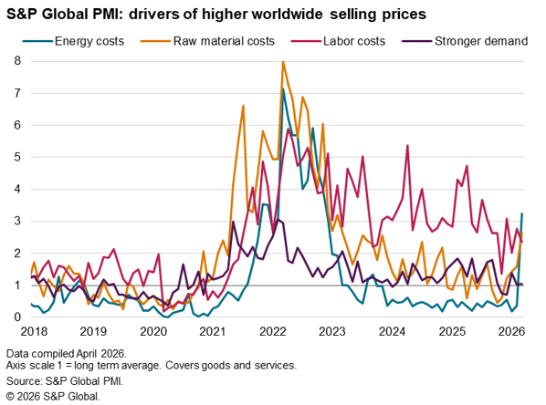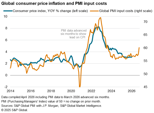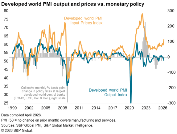 Measured across both goods and services, average input prices meanwhile rose worldwide in March at the fastest pace since January 2023. This points to global consumer price inflation accelerating close to 5% in the coming months, up from 3.1% in January.
