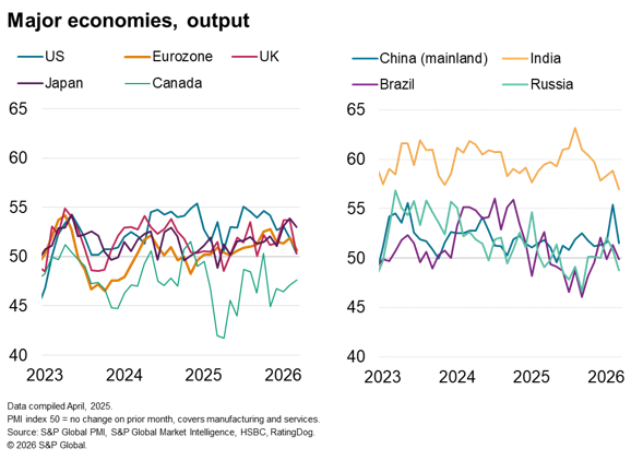 The survey data therefore suggest that global economic growth has already taken a material negative hit from the outbreak of war in the Middle East on 28 February, which has derailed gathering upturn seen in the lead up to the conflict. The lower PMI reading signals a deceleration of global economic growth from 3.0% in February to an annualized quarterly rate of 2.0% in March.