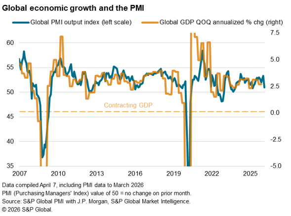 Global economic growth slumped in March following the outbreak of war in the Middle East. The J.P.Morgan Global Composite PMI Output Index, compiled by S&P Global, fell from February’s 21-month high of 53.3 to 51.0 in March, the lowest since last April (when the US announced far-reaching tariffs) and second-lowest since 2023.
