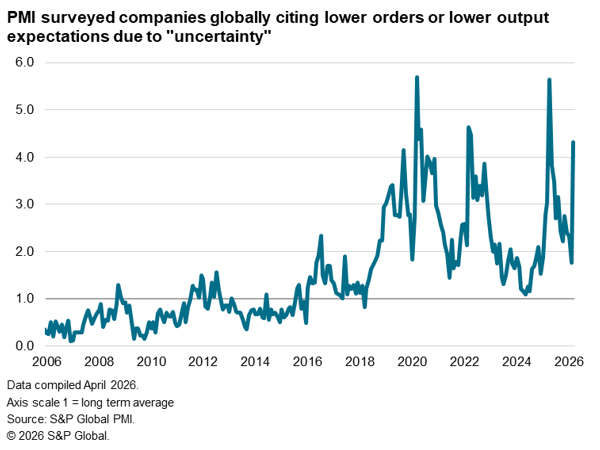 Reports of ‘uncertainty’ having adversely affected business order books and growth expectations for the year ahead have spiked to one of the highest levels seen over more than two decades of comparable survey history. Only the COVID-19 lockdowns and the April 2025 US tariff announcements have seen higher levels of damaging business uncertainty than reported in March since data were first available in 2005.