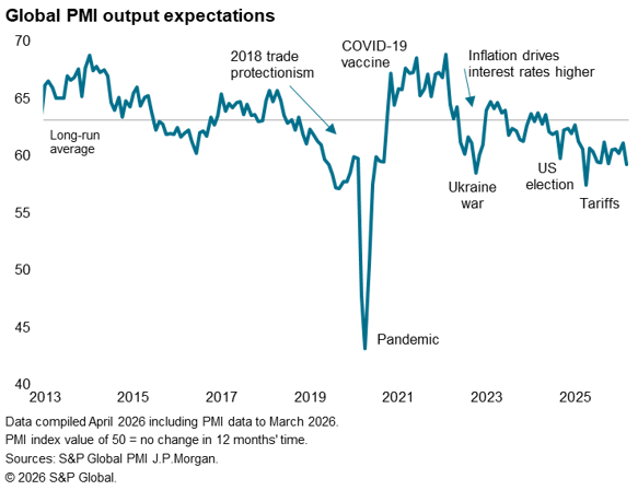 The war also hit business growth expectations, reflecting the direct effect on confidence via heightened uncertainty but also reflecting the demand-sapping impact of higher prices. New orders rose globally at the slowest rate since November 2023, helping pull global output expectations for the year ahead to the lowest since October 2022 barring only the drop seen in response to the US tariff announcements in April 2025.