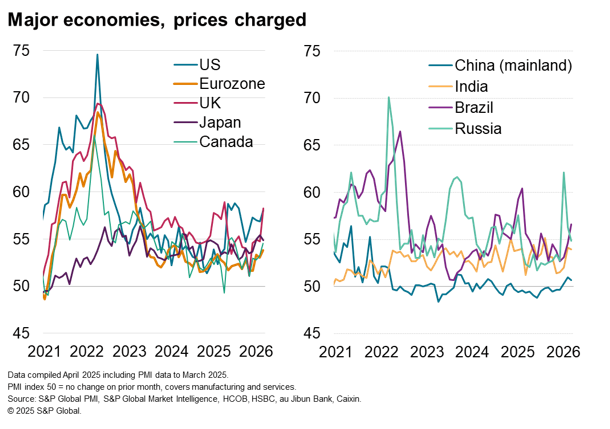 An especially steep jump in prices was recorded in the UK, where the overall rate of selling price increase rose to the highest since June 2023. US price growth also remained steep, accelerating to a seven-month high, while a 13-month high was seen in Brazil and a 31-month high reported In Australia. Inflation across the eurozone remained relatively muted but nonetheless prices rose at a rate not seen since February 2024, led by Spain and Italy.