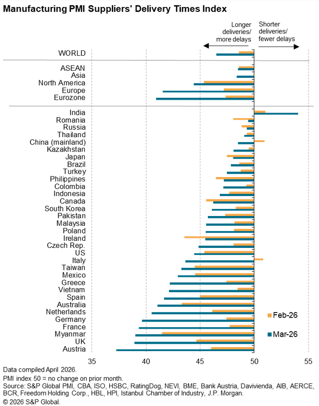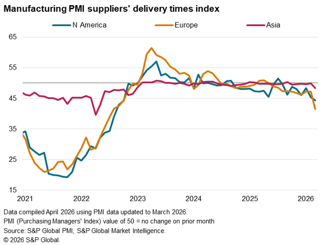 Supply chain pressure was nonetheless also widely reported across North America, with the war in the Middle East exacerbating supply delays arising from US tariffs to lead to the longest lengthening of lead times since October 2022.