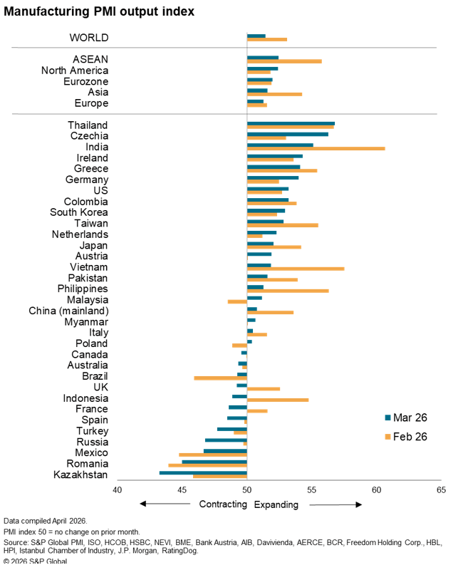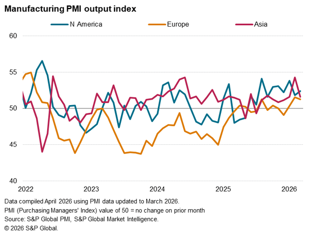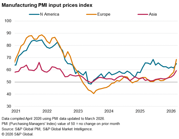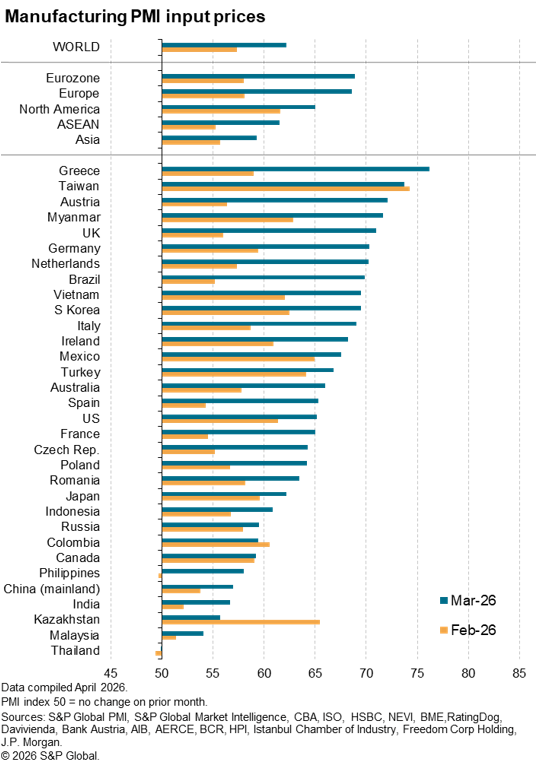 Global manufacturing PMI survey data illustrate the varying degrees to which the economic impact of the war in the Middle East has spread worldwide, with production typically hit hardest in various European economies geographically closest to the war and those Asian economies that have a high dependency on supply lines through the Strait of Hormuz. However, the greatest overall impact on supply chains and input costs so far has clearly been in Europe.