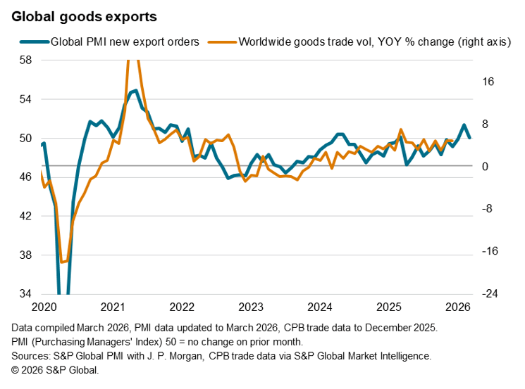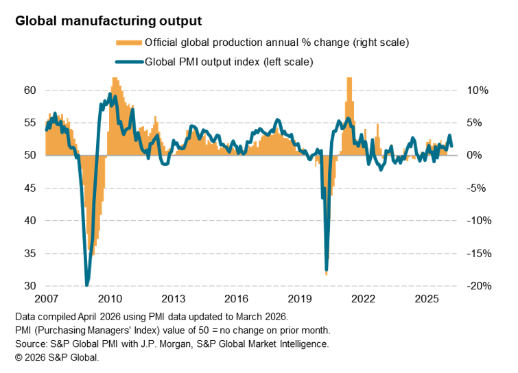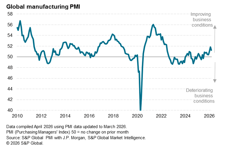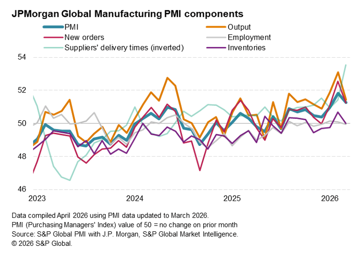 The global manufacturing recovery has been knocked off course by the outbreak of war in the Middle East. Having risen to a 44-month high of 51.8 in February, the headline manufacturing Purchasing Managers’ Index (PMI), sponsored by J.P. Morgan and compiled by S&P Global Market Intelligence, fell to 51.3 in March.